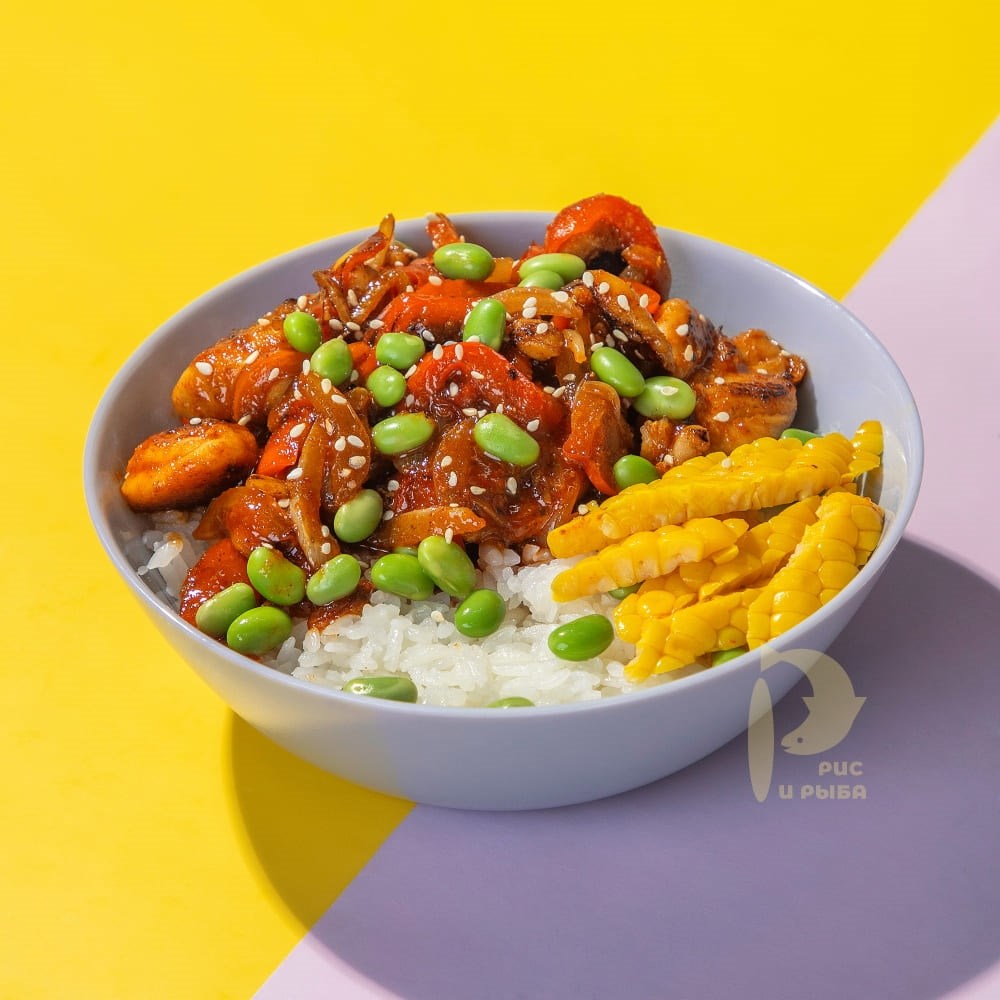320 грамм. Состав: курица, фирменный маринад, рис, вешенки, зеленый лук, бобы эдамаме, кукуруза, белый кунжут, болгарский перец.