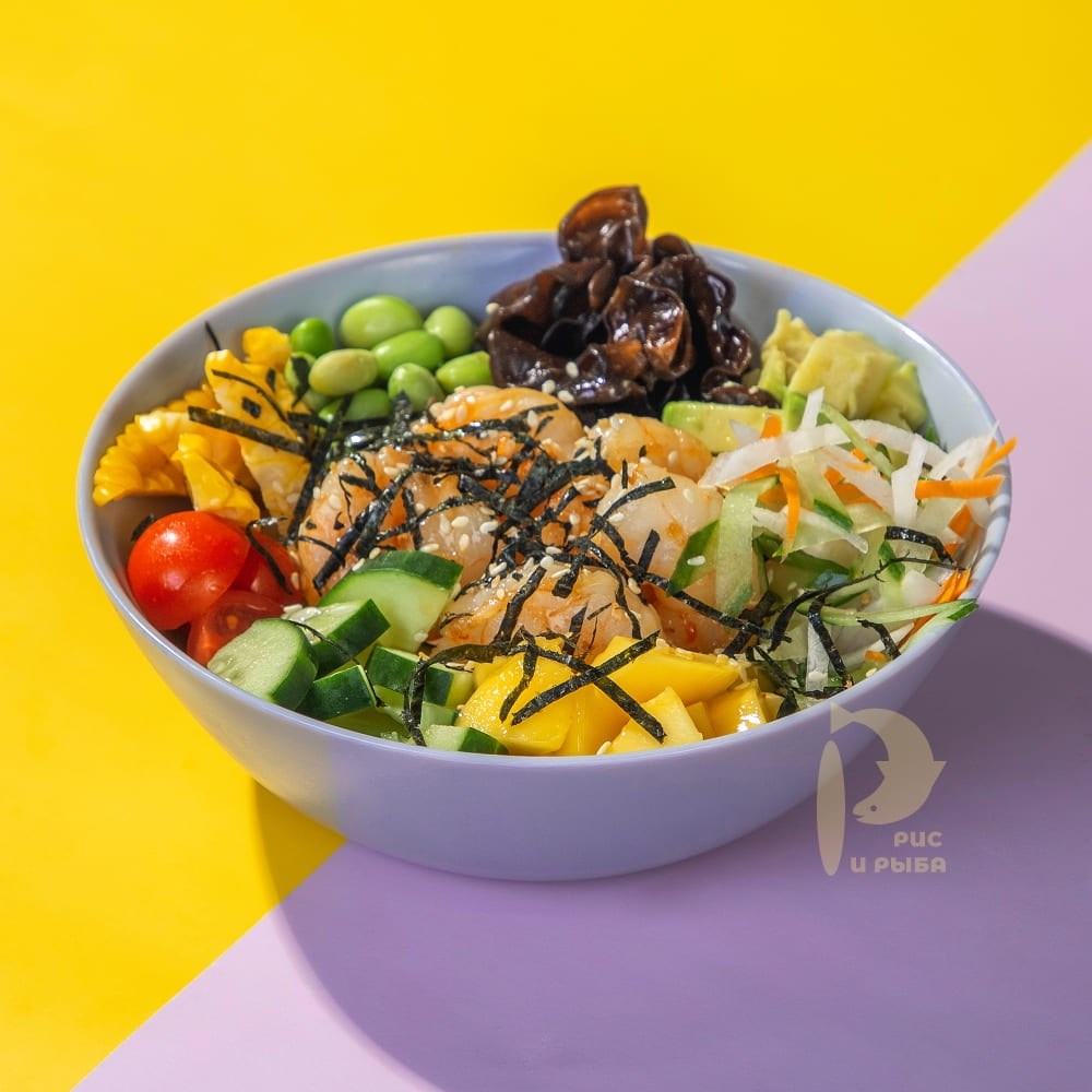 350 гр. Состав: рис, креветка, манго, авокадо, эдамаме, огурец, помидоры черри, соус чили, кукуруза, древесные грибы, морковь, дайкон, кунжут, лук зеленый, нори, понзу, спайси.