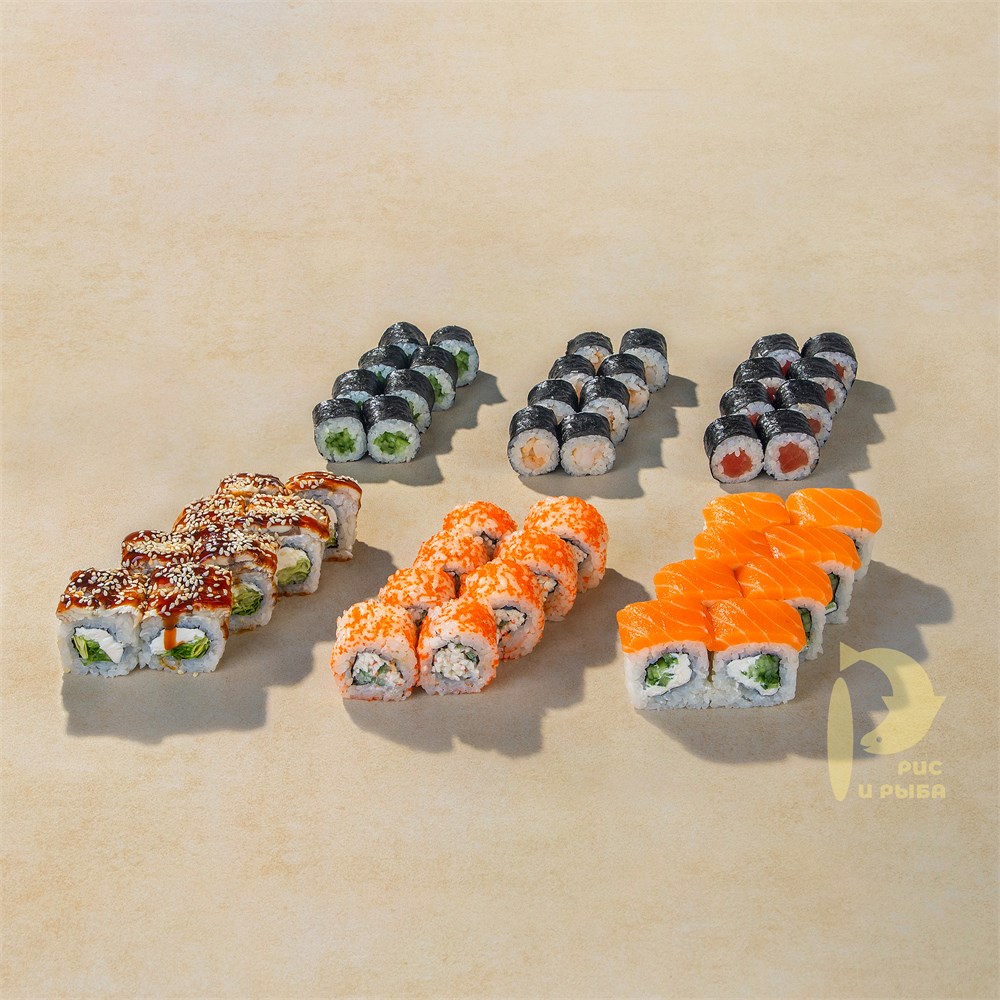 850 грамм. Состав: Филадельфия лайт, Ролл с угрем, Калифорния снежный краб, Маки с креветкой, Маки с огурцом, Маки с тунцом.
