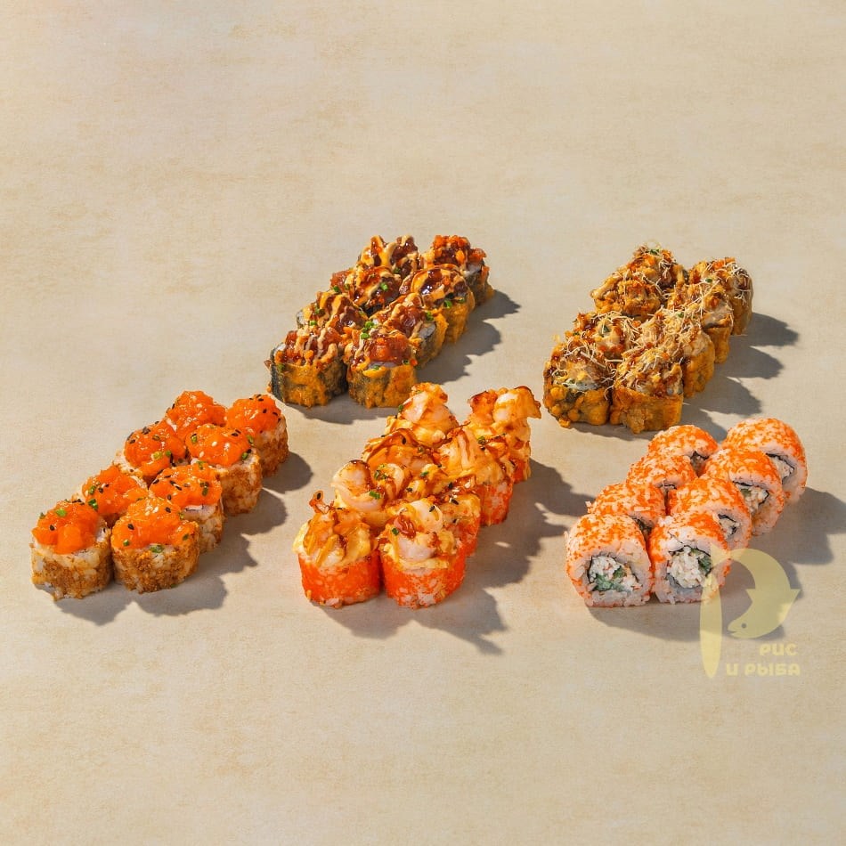 2150 грамм. Состав: Филадельфия лайт, Калифорния снежный краб, Креветка с мисо карамелью, Запеченный ролл с курицей, Запеченный ролл с мидией и креветкой, Запеченный ролл со снежным крабом, Темпура ролл с курицей в трюфельном соусе, Темпура ролл со спайси креветкой (6шт), Темпура ролл с лососем.