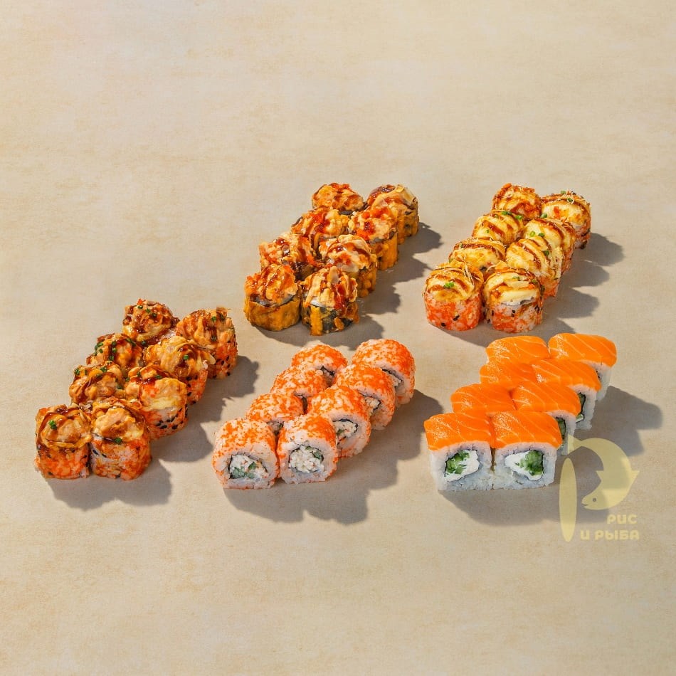 1100 грамм. Состав: Филадельфия лайт, Калифорния снежный краб, Запеченный ролл с лососем, Запеченный ролл с соусом пармезан, Темпура ролл с лососем и снежным крабом.